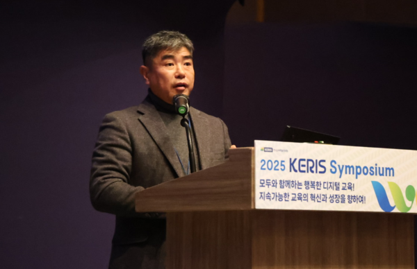김봉제 서울교대 교수 겸 AI가치판단디자인센터장이 6일 대구 호텔인터불고대구 컨벤션홀에서 열린 ‘2025 KERIS 심포지엄’에서 AI 시대 기술보다 인간 관계성 회복이 더 중요하다고 강조했다.