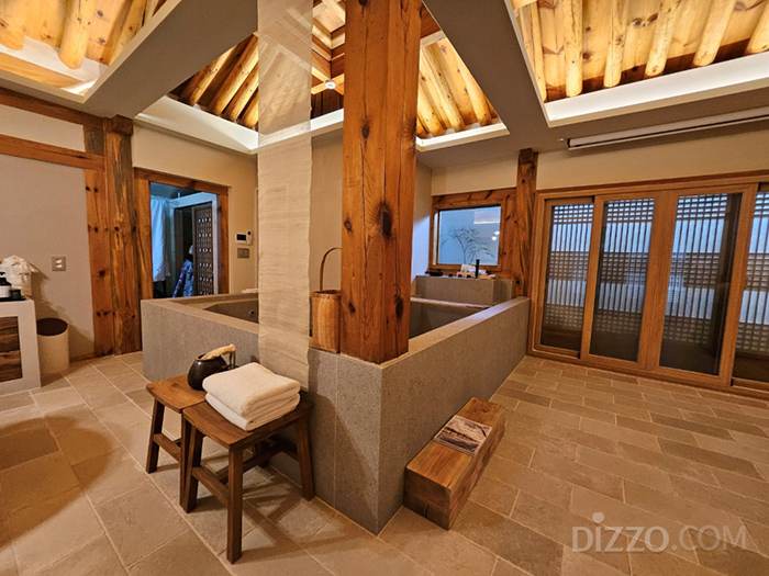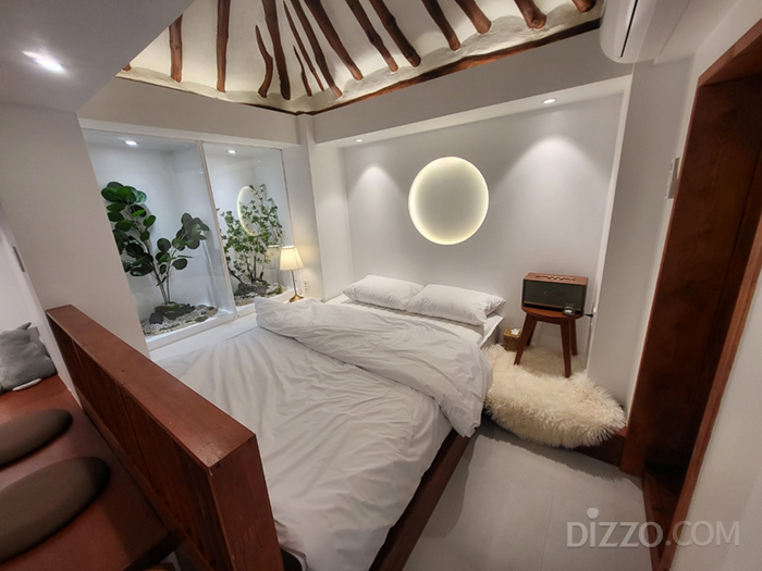 최대 3인까지 이용 가능한 아늑한 공간으로, 퀸사이즈 침대를 중심으로 실내 자쿠지와 빔 프로젝터, 블루투스 스피커 등 편의 시설을 갖췄다. 전통 한옥의 분위기에 현대적인 감각을 더해 완성도 높은 휴식 공간을 구현했다.