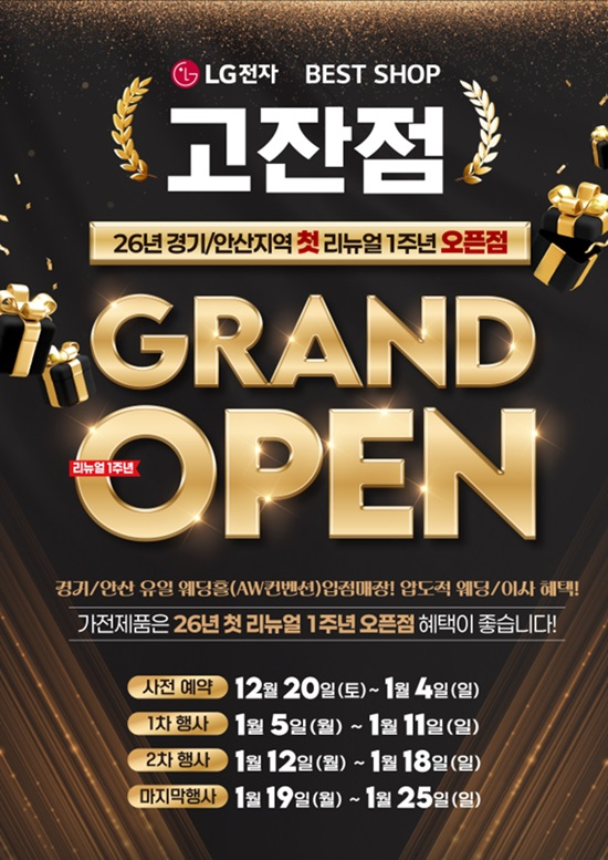 LG전자 베스트샵 고잔점이 경기·안산지역 첫 리뉴얼 매장 오픈 1주년을 맞아 GRAND OPEN 행사를 진행한다고 밝혔다. 이번 행사는 새해를 앞두고 가전 교체, 혼수, 이사 수요 고객을 대상으로 마련됐다.