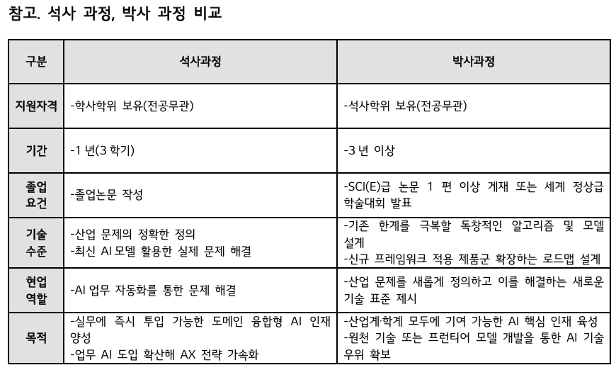 박사 과정은 산업 현장의 복잡한 문제를 새롭게 정의하고, 이를 해결할 수 있는 독창적인 방법론을 개발하는 연구 리더를 양성하는 것을 목표로 하며, 3년 이상의 파견 과정으로 운영한다. 특히 박사 과정의 졸업 요건으로는 SCI(E)급 논문 1편 이상 게재 또는 세계 정상급 학술 대회 발표가 필수로 포함되어 있어 산업 현장과 학계 모두에 기여할 수 있는 인재를 배출하는 데 중점을 둔다.