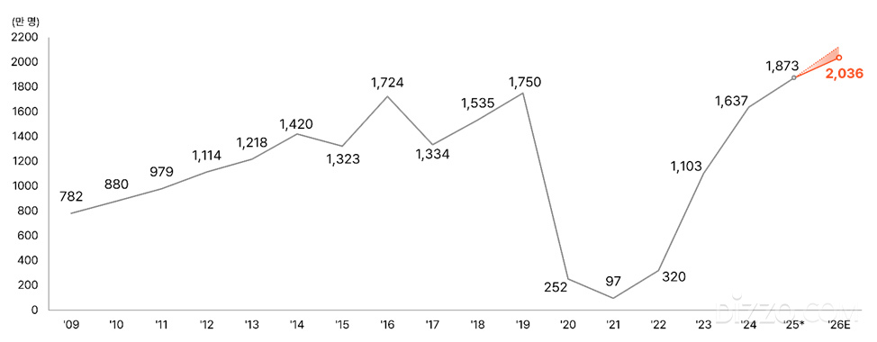 2026년 방한 외래 관광객이 2,000만 명을 돌파하며 역대 최고치를 경신할 것이라는 전망이 나왔다. 하지만 우리 국민의 해외여행 역시 3,000만 명대로 늘어나면서 약 1,000만 명 규모의 '인아웃바운드 불균형'은 지속될 것으로 예측됐다.
