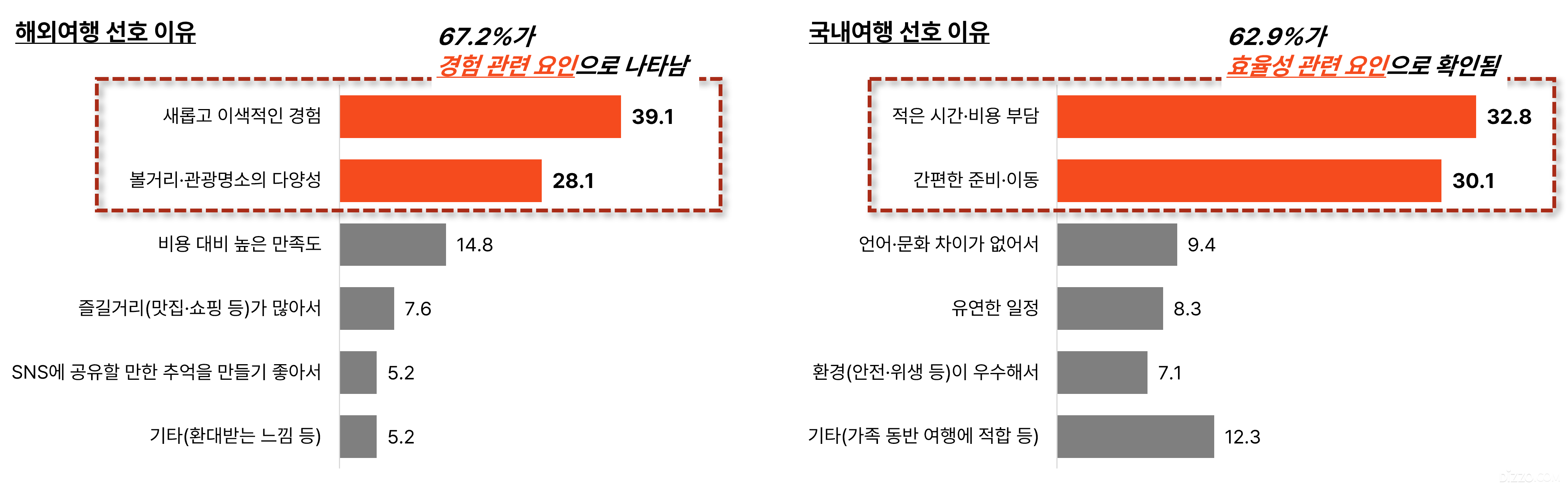 실제 소비자 조사 결과, 해외여행은 '새로운 경험'을 위한 투자로 인식(67.2%)하는 반면, 국내여행은 가성비를 따지는 '기능적 소비'로 여기는 경향이 강했다. 국내여행 의향은 높지만(50% 이상) 해외여행 수준의 비용을 지불할 의향은 18%에 그쳤다. 54.6%는 해외여행 지출액의 30~50%만 국내여행에 지출하겠다고 답했다.