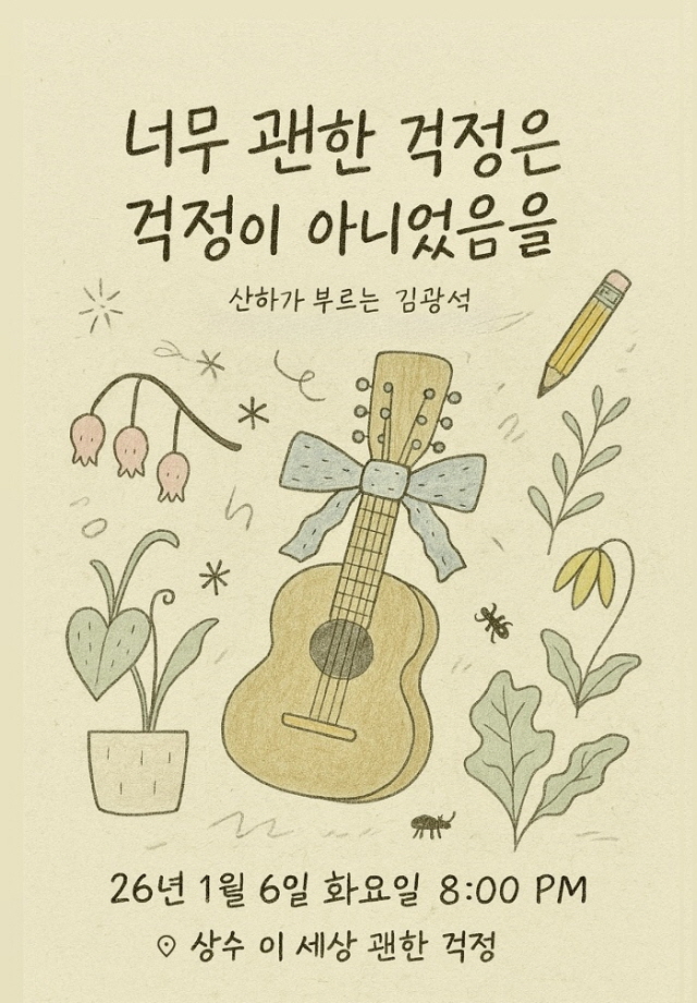 지난 1월 6일 대학로 아르코꿈밭극장(옛 학전극장)에서 열린 ‘제3회 김광석 노래상 경연대회’에서 대상인 ‘김광석상’을 수상한 싱어송라이터 산하가, 홍대 ‘이세상괜한걱정’ 공간에서 소규모 콘서트를 개최한다. 이번 무대는 현대 음악 환경 속에서 노래가 사람에게 다시 희망을 건네는 순간에 집중하겠다는 의미를 담고 있다.
