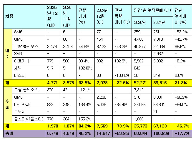 르노코리아가 지난해 12월 한 달 동안 내수 4771대, 수출 1978대 총 6749대를 판매했다고 5일 밝혔다. 이는 2024년 동기 대비 53.9% 감소한 수치다.
