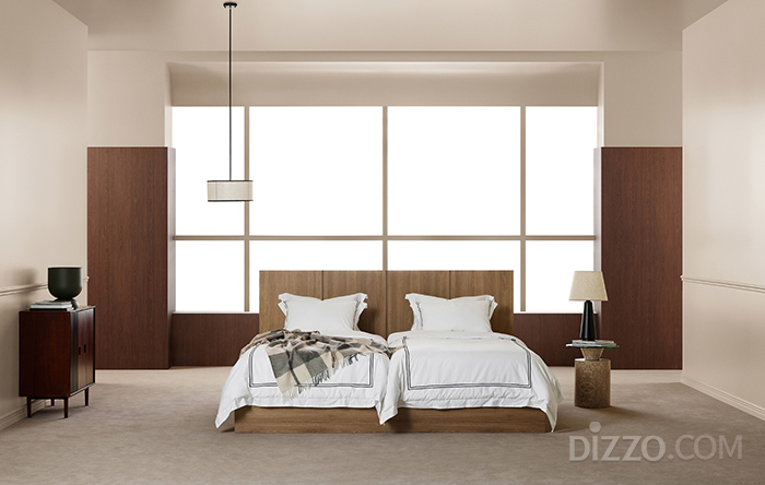 가장 눈길을 끄는 제품은 시몬스가 처음으로 선보이는 트윈슈퍼싱글 사이즈 프레임 '하우티'다. 슈퍼싱글(SS) 매트리스 두 개를 하나의 프레임에 올려놓는 구조로, 부부가 각자의 수면 취향에 맞춘 매트리스를 선택하면서도 시각적으로는 하나의 침대를 사용하는 효과를 낸다. 아트월 형태의 헤드보드와 내추럴오크 색상이 어우러져 모던한 호텔 침실 분위기를 연출한다.