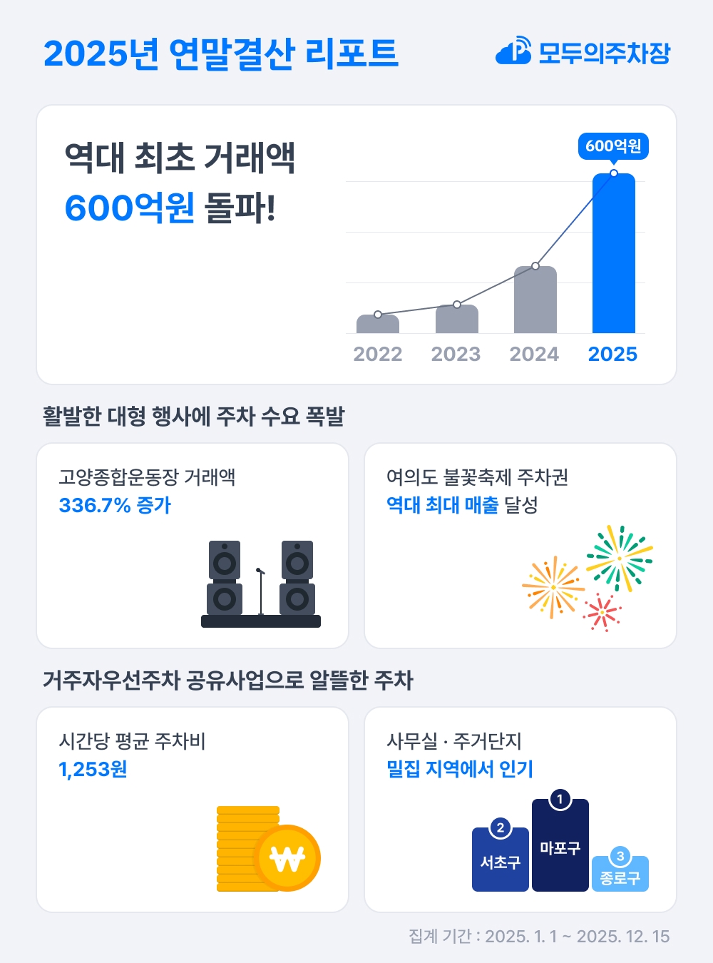 ㈜쏘카의 온라인 주차 플랫폼 모두의주차장이 지난해 1월부터 12월 중순까지의 데이터를 분석한 결과, 주차권 거래액은 2024년 동기 대비 28.7% 증가하며 처음으로 600억원을 돌파한 것으로 나타났다. 누적 가입자는 550만명을 기록했다.