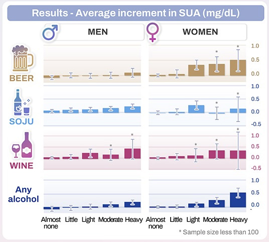 여러 주종을 섞어 마실 때에는 남녀 모두에서 요산 수치가 더 높아지는 경향이 나타났다. 연구팀은 “맥주와 소주는 와인에 비해 1회 음주 시 소비량이 많은 경향이 있어, 요산 상승에 미치는 ‘양적 효과’가 클 수 있다”고 설명했다.