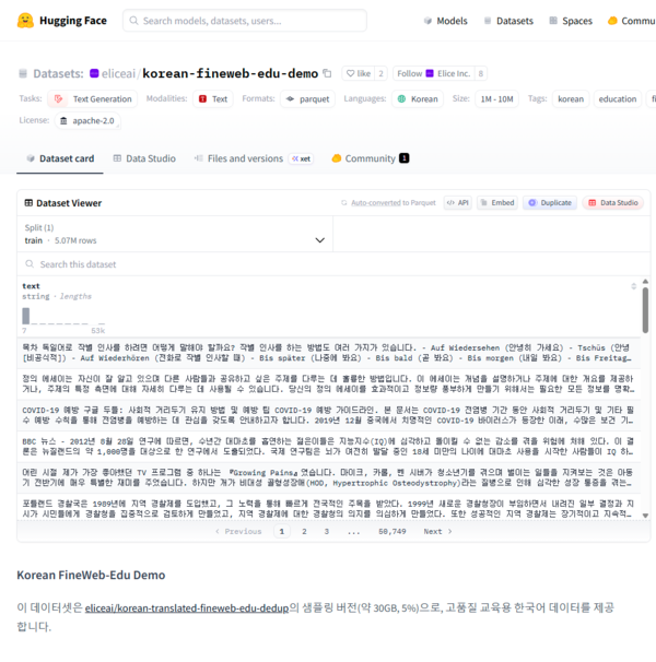 데모의 원본인 ‘korean-translated-fineweb-edu-dedup’은 약 1900억(190B) 토큰 규모의 대형 텍스트 데이터셋으로 수천만 페이지 분량에 해당한다. 다국어 데이터를 함께 활용할 경우 파운데이션 모델 학습에 활용 가능한 수준의 규모다. 이번에 공개한 ‘한국어 파인웹 교육 데이터셋 데모’는 이 중 5% 분량의 샘플이지만 오픈소스로 공개된 한국어 고품질 데이터셋 중에서는 대규모 수준에 해당한다.