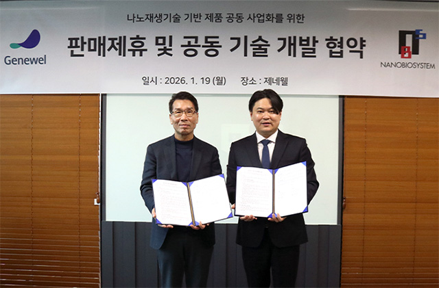 제네웰(대표이사 한상덕)이 첨단 재생 바이오 스타트업 나노바이오시스템(대표이사 김장호)과 함께 나노 재생 기술을 적용한 의료기기 및 코스메틱 제품 공동개발에 나선다.