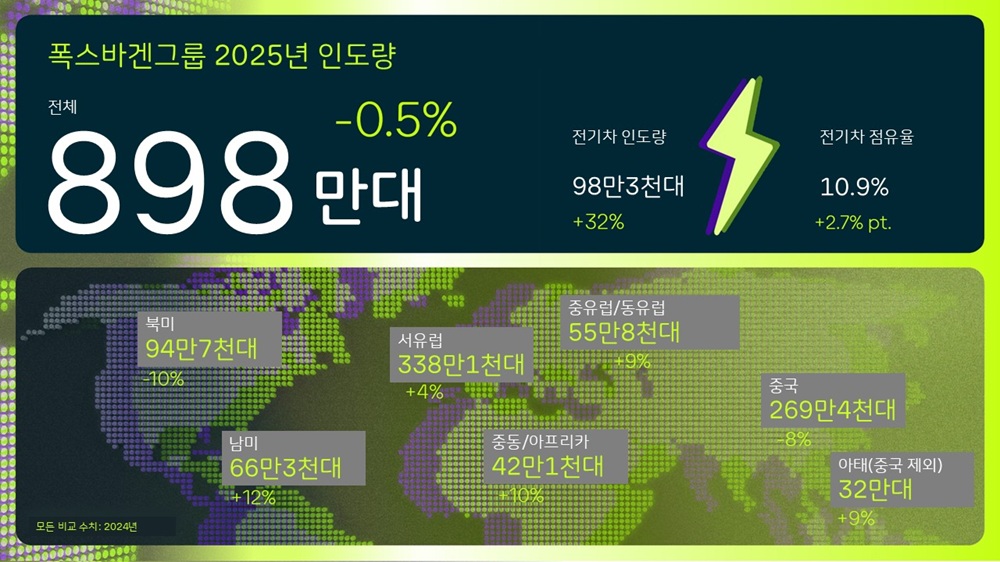 폭스바겐그룹은 2025년 한 해 동안 전 세계에서 총 898만대를 인도했다고 21일 밝혔다. 이는 2024년(903만대) 대비 0.5% 감소한 수치다. 중국과 북미 시장의 부진에도 불구하고 유럽과 남미에서의 견조한 성장, 그리고 전기차(BEV)와 플러그인 하이브리드(PHEV)의 가파른 확대가 실적을 뒷받침했다.