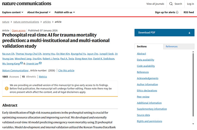 이진석 교수는 “구급 단계처럼 제한된 정보 환경에서도 환자의 위험도를 정량적으로 예측할 수 있음을 데이터로 확인했다”며 “향후 검증 범위를 단계적으로 확대하고, 임상 현장 적용 가능성을 신중히 검토해 나갈 계획”이라고 말했다.