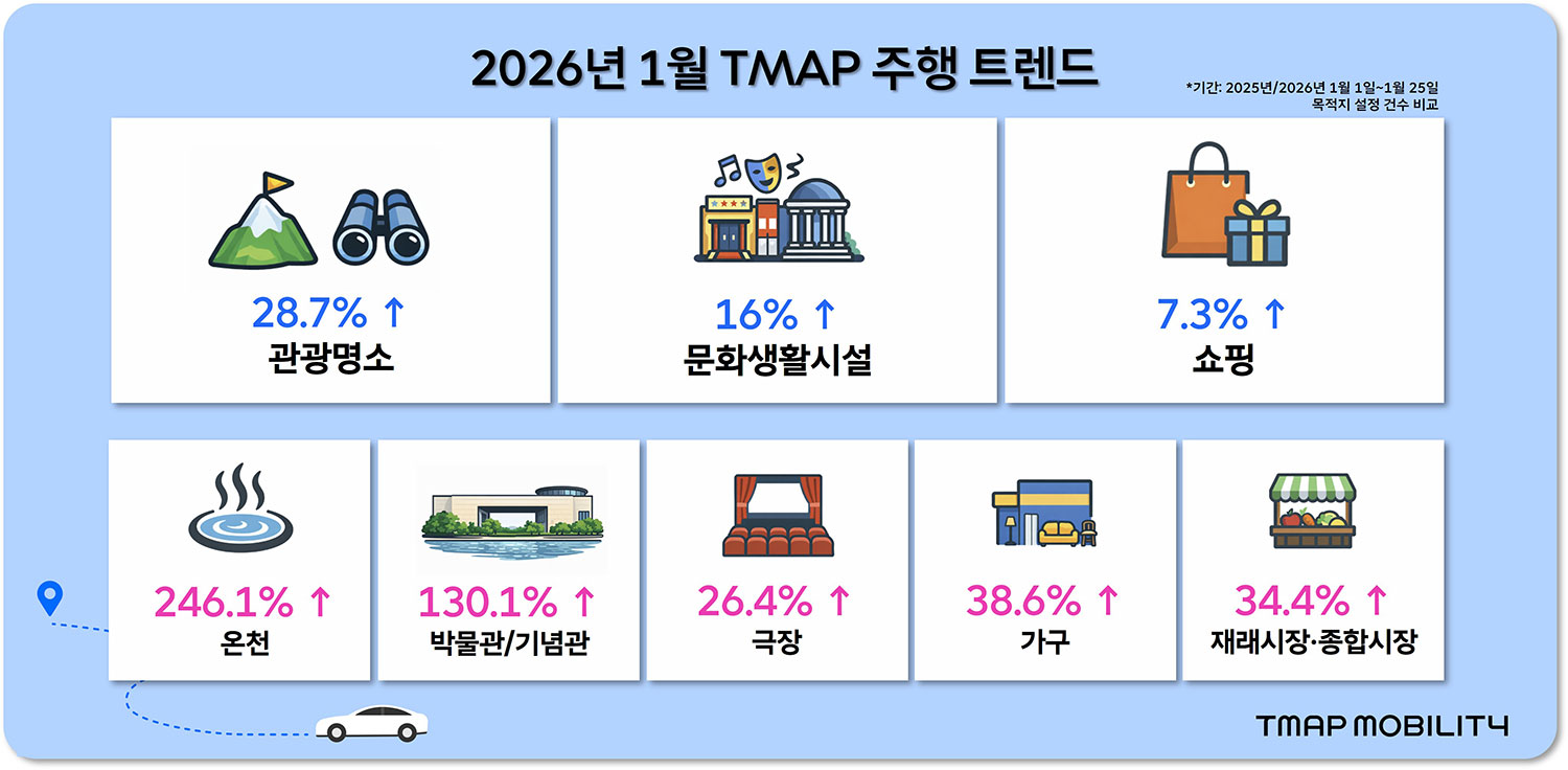 티맵모빌리티 관계자는 "이번 신년 주행 데이터는 연초 이동이 특정 이벤트성 활동보다 실내에서 휴식과 소비, 여가를 함께 해결할 수 있는 목적지로 집중됐음을 보여준다"며, "앞으로도 주행 데이터를 기반으로 계절과 환경 변화에 따른 이동 흐름을 분석해 이용자에게 유용한 인사이트를 제공할 계획"이라고 말했다.
