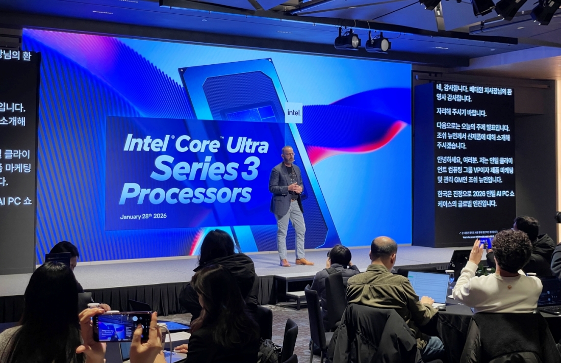 인텔이 18A 공정 기술을 적용한 차세대 프로세서 ‘코어 울트라 시리즈 3(코드명 팬서레이크)’를 28일 공식 발표했다. 삼성동 웨스틴 서울 파르나스에서 열린 ‘2026 인텔 AI PC 쇼케이스 기자간담회’에서는 코어 울트라 시리즈 3가 탑재된 AI PC 제품군을 공개했다.