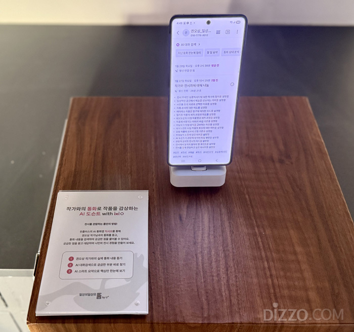 LG유플러스의 AI 기술 '익시오(ixi-O)'를 활용한 AI 도슨트도 눈길을 끈다. 작가와의 실제 통화 내용을 녹음해 구축한 서비스로, 관람객이 궁금한 점을 능동적으로 검색하고 답을 찾을 수 있도록 설계됐다. 일방적인 정보 전달을 넘어 대화형 감상 경험을 제공한다는 점이 특징이다.
