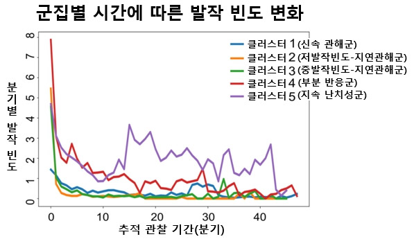 분석 결과, 발작이 소실되는 경과를 보인 세 개 군집과 치료 이후에도 발작이 지속된 두 개 군집이 확인됐다. 발작 관해군 가운데 ‘신속 관해군’에서는 면역·감염과 연관된 뇌전증이 상대적으로 많이 포함됐고, ‘저발작빈도-지연관해군’에서는 뇌파 검사에서 전반적인 서파가 관찰되며 뇌 MRI에서 뇌연화증이 동반된 경우가 많았다. ‘중발작빈도-지연관해군’에서는 전반뇌전증의 임상적 특성이 두드러졌다.