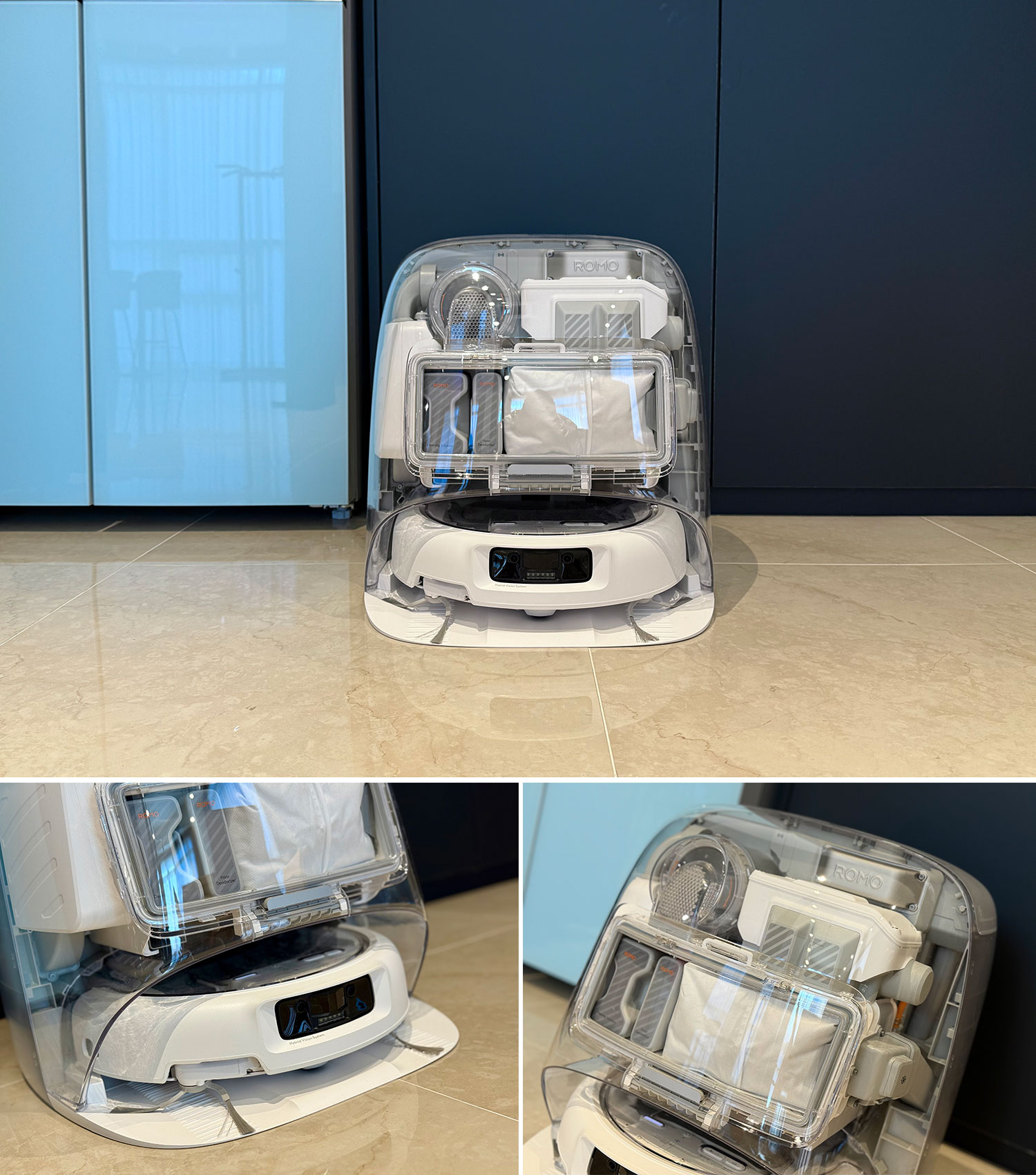 특히 ROMO P는 클리닝 솔루션과 바닥 탈취제를 각각 수납할 수 있다. 주방에서는 세정제를 활용해 기름때를 제거하고, 거실에서는 탈취제를 사용해 은은한 향기를 더하는 식이다.
