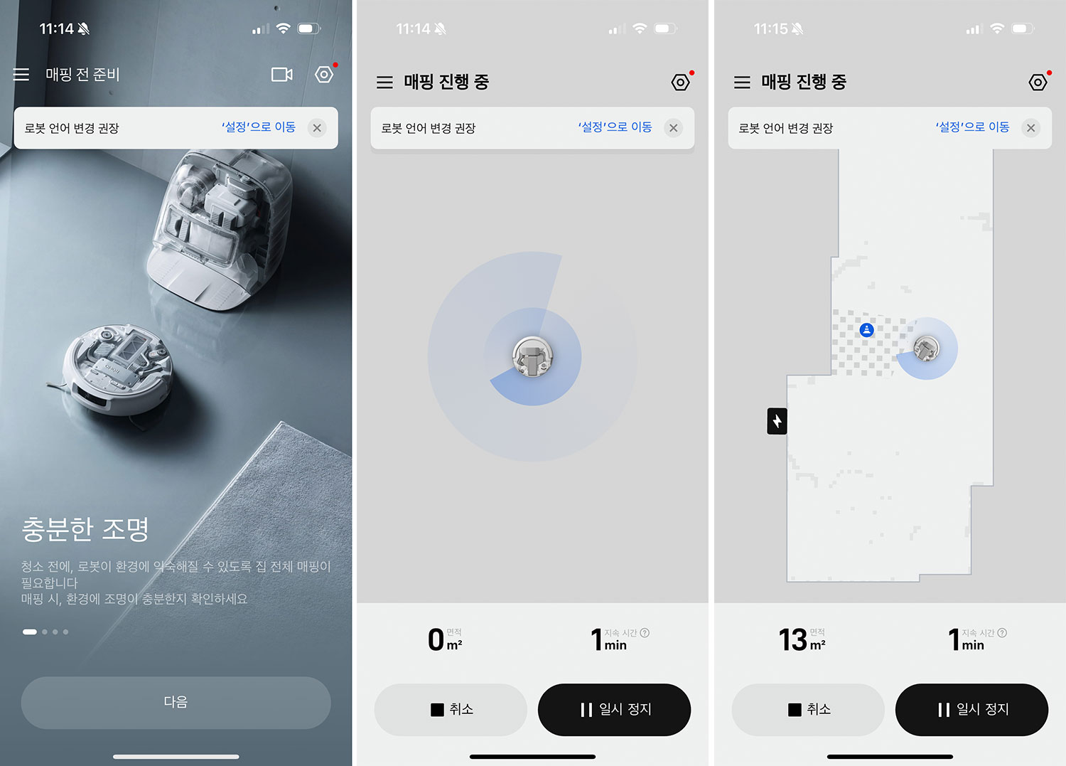 앱 메인 화면에는 현재 지도와 함께 주요 청소 옵션이 한눈에 배치된다. 방별 선택 청소, 구역 지정 청소, 출입 금지 구역 설정, 카펫 회피/집중 모드, 반려동물 구역 설정 등이 직관적으로 구성돼 있다. 메뉴가 복잡하게 겹쳐 있지 않아 초보자도 비교적 쉽게 적응할 수 있다.