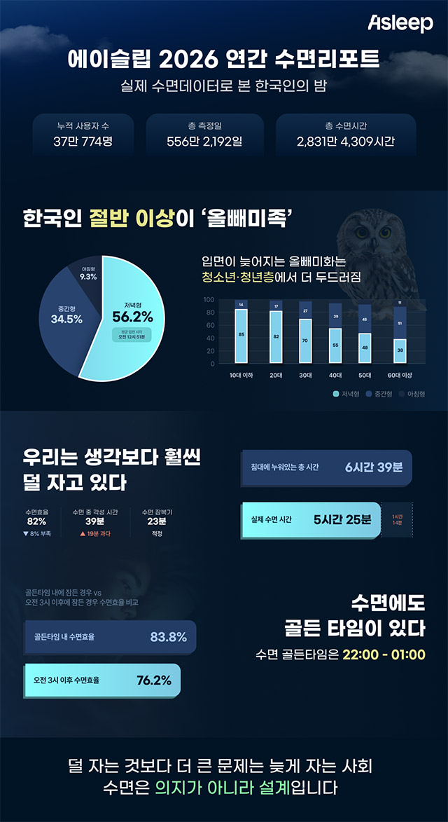 슬립테크 기업 에이슬립(Asleep)이 발표한 ‘2026 대한민국 수면 리포트’에 따르면 수면 앱 이용자의 평균 잠자리에 머문 시간은 6시간 39분으로 집계됐다. 그러나 실제 수면 시간은 5시간 25분에 그쳐 두 시간 사이에 1시간 14분의 차이, 이른바 ‘수면 공백’이 나타났다.