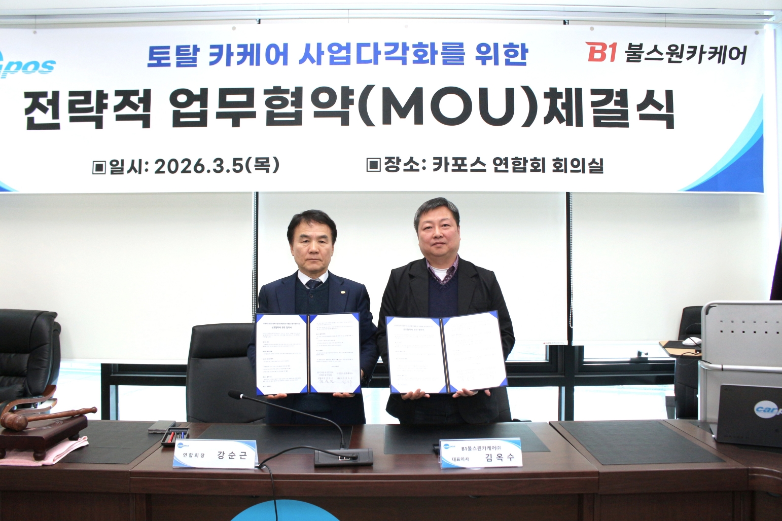지난 5일 충북 청주 카포스 연합회 대회의실에서 열린 체결식에는 B1불스원카케어 김옥수 대표이사, 카포스 강순근 연합회장이 참석했다.