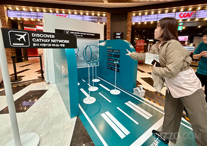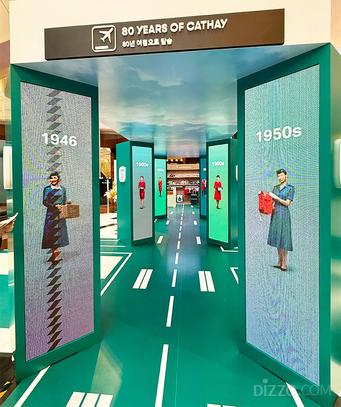 팝업의 중심 전시는 '히스토리 런웨이'다. IFC몰 어느 층에서도 내려다볼 수 있도록 설계된 메인 공간에 80년간 캐세이퍼시픽이 운용한 항공기 모델 6종과 승무원 유니폼 변천사 6종을 화면으로 구성했다. 방문객이 팝업에 들어서는 순간 가장 먼저 눈에 들어오는 구성으로, 창항 이후 80년의 성장 궤적을 시각적으로 압축해 보여준다.
