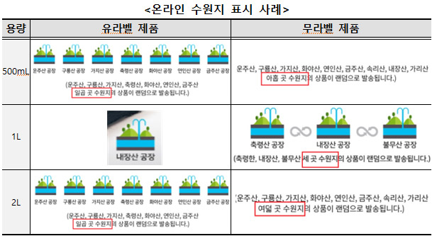 온라인 판매 정보도 충분하지 않은 것으로 조사됐다. 수원지가 두 곳 이상인 제품의 경우 판매업체가 여러 수원지의 제품을 무작위로 배송해 소비자가 실제 배송을 받기 전까지 수원지를 확인하기 어려운 사례가 있었다.