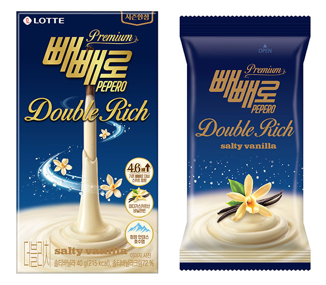 롯데웰푸드는 빼빼로 브랜드의 첫 프리미엄 라인 제품인 더블리치 솔티바닐라를 출시한다했다. 이번 제품은 기존 제품보다 코팅층을 두껍게 구성한 더블 레이어 구조를 적용해 식감과 풍미를 강화한 것이 특징이다. 스위트 코팅 함량은 기존 빼빼로 대비 약 4.6배 수준으로 늘어났다.