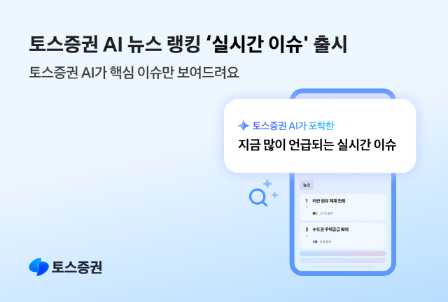 토스증권은 25일 AI 뉴스 랭킹 서비스 ‘실시간 이슈’를 출시했다고 밝혔다. 이 서비스는 국내외 뉴스 발행량과 이용자 관심도 등을 종합 분석해 시장 영향력이 높은 이슈 20개를 실시간으로 제공한다.