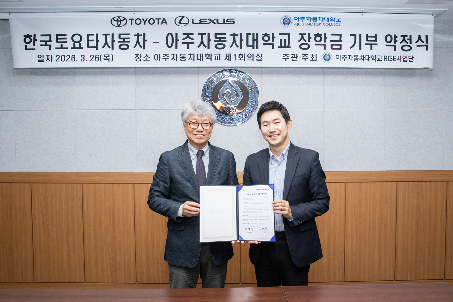 한국토요타자동차(이하 한국토요타)가 미래 자동차 산업을 이끌어갈 전문 인재 육성을 위해 아주자동차대학교에 장학금 8000만원을 전달하고, 시승 체험 중심의 모터스포츠·전동화 교육 프로그램을 운영했다고 27일 밝혔다.