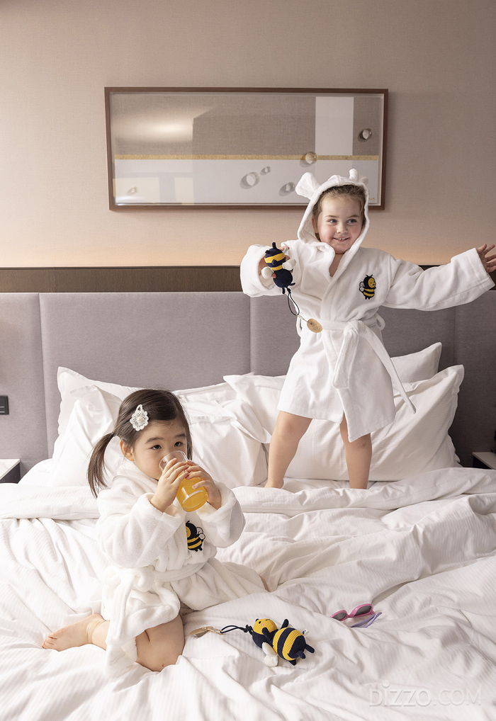 '무제한'이라는 키워드가 패키지 전면에 등장한 것은 단순히 가성비 소구가 아니다. 부모가 따로 일정을 조율하지 않아도 아이는 하루 종일 호텔 안에서 채워진다는 메시지다. 부모의 '온전한 휴식'은 이 구조에서 자연스럽게 따라오는 부산물이다. 더블트리 바이 힐튼 서울 판교가 선보인 '리틀 럭스(Little Luxe)' 패키지도 같은 논리 위에 설계됐다. 꿀벌 캐릭터 '비해피'를 테마로 운영하는 허니콤 키즈 라운지는 정글짐·미디어 아트 볼풀·원목 교구존을 갖춘 키즈 전용 공간이고, 그 안에 보호자를 위한 맘스 라운지를 병치했다. 아이가 노는 공간과 부모가 쉬는 공간을 물리적으로 분리하되 동선은 연결한 구조다. 여기에 인근 한국잡월드 투숙객 할인을 더해 숙박 외 체험 반경을 확장했고, 이번에 새로 개장한 '비 가든 아트 워크존'에서는 아이가 직접 만든 콜라주 작품을 기념품으로 가져갈 수 있게 했다.