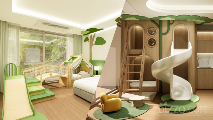 객실 자체를 놀이 공간으로 전환하는 접근도 가속화하고 있다. 리솜리조트가 충북 제천 포레스트 리솜에 선보인 솜니아 키즈룸은 기존 객실을 리모델링해 자체 키즈 브랜드 세계관을 투숙 공간에 구현했다. S30 타입은 거실 중앙에 대형 트리하우스와 나선형 실내 슬라이드를 배치했고, 트리하우스 아래 비밀 침대 공간을 두어 놀이와 수면이 이어지게 했다. S20 타입은 원목 미끄럼틀과 아치 구조물, 텐트 하우스를 스튜디오 구조 안에 압축했다. 두 타입 모두 모서리를 최소화한 곡선 디자인을 적용하고 사이드가드·유아용 변기 커버·키즈 전용 로브를 기본 구비했다. 체험 공간을 외부에 두는 대신 객실 안으로 들여온 형태로, 이동 없이도 아이가 충분히 놀 수 있는 환경을 객실이 자체적으로 해결한다.