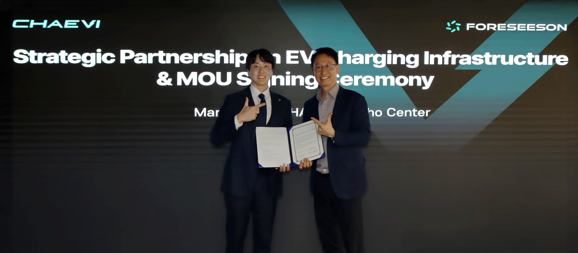 채비가 지난 27일, 채비 강남서초센터에서 캐나다 BC주 리치먼드에 본사를 둔 친환경 에너지·전기차 인프라 기업 포시즌 테크놀로지(이하 포시즌)와 전기차 초급속 충전 인프라 구축 및 에너지 저장 장치·운영 소프트웨어 사업 협력을 위한 공급계약을 체결했다고 30일 밝혔다.