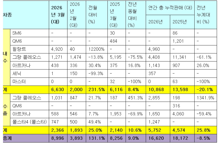 수출은 2366대로 전년 동기 대비 10.6% 증가했다. 차종별로는 그랑 콜레오스 1031대, 아르카나 588대가 포함됐으며, 폴스타 4 북미 수출 물량 747대도 실적에 반영됐다.