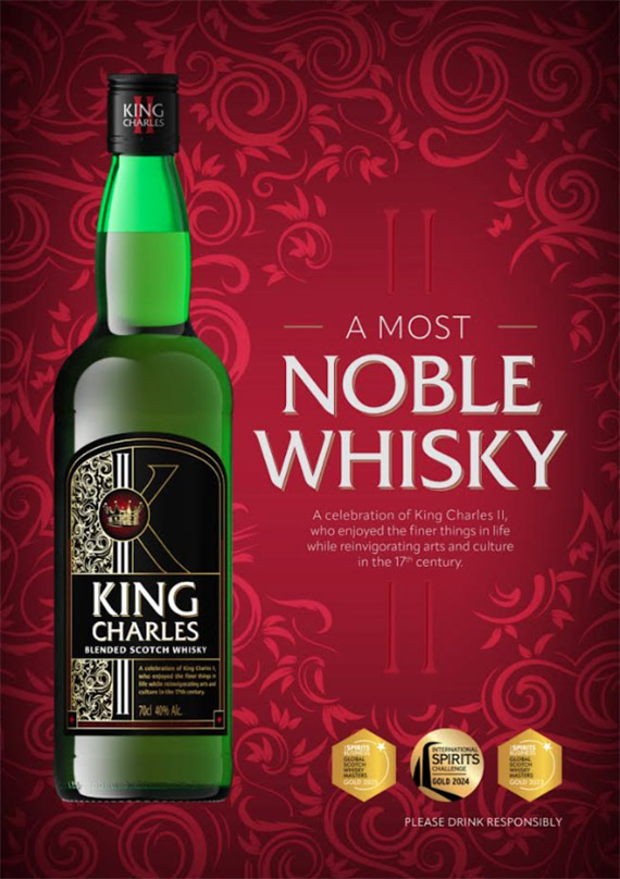 킹 찰스 블렌디드 스카치 위스키는 하이트진로가 2023년 11월부터 국내 유통을 맡아온 제품으로, 17세기 영국 찰스 2세 국왕을 모티브로 개발됐다. 스코틀랜드 스페이사이드와 하이랜드 지역의 몰트 원액에 로우랜드 그레인 위스키를 블렌딩해 완성했으며, 바닐라 향과 부드러운 단맛이 특징이다.