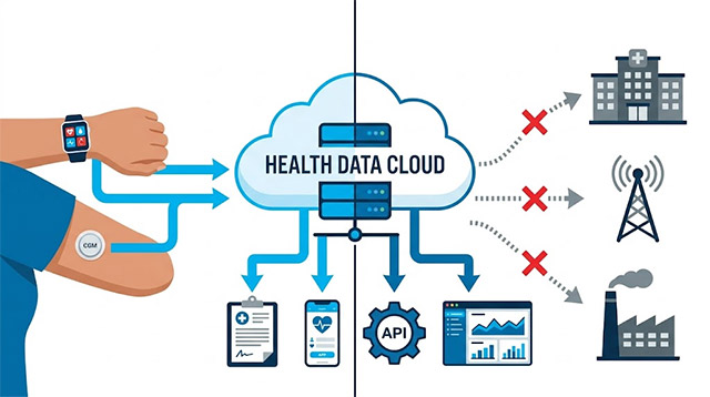 연속혈당측정기(CGM)를 보면 데이터 흐름은 비교적 명확하게 드러난다. 센서가 측정한 혈당 데이터는 스마트폰 앱을 거쳐 제조사의 클라우드 서버로 전송되고, 이후 리포트로 가공되거나 외부 서비스와 연동된다.