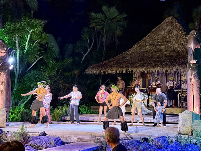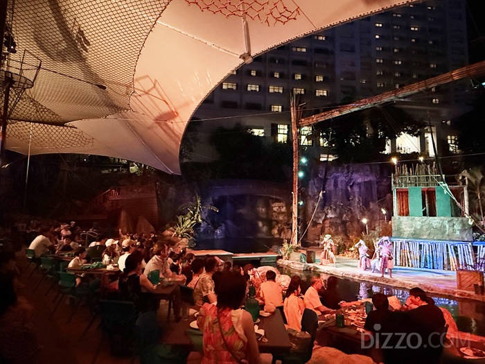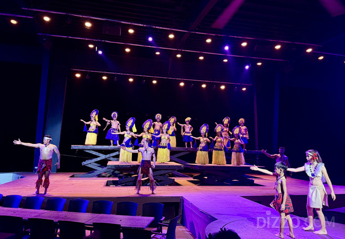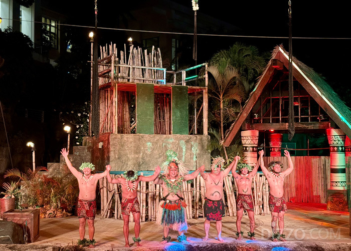 공연의 서사는 이렇다. 거센 태풍에 휘말려 괌에 좌초한 보물선, 이를 쫓는 해적, 그리고 섬 주민들의 운명이 뒤얽히는 45분간의 대서사시. 해적선 모양의 무대 위에서 고공 로프 싸움과 밧줄 액션이 펼쳐지고, 불쇼와 공중 스턴트, 라이브 음악이 교차한다. 배우들이 객석으로 직접 내려와 관객과 호흡하는 장면도 있어, 보는 내내 무대와 객석의 경계가 흐려진다. 식사는 차모로 스타일 BBQ 플래터가 테이블당 개별 제공되고, 별도 뷔페대에서 애피타이저·샐러드·디저트를 추가할 수 있다.