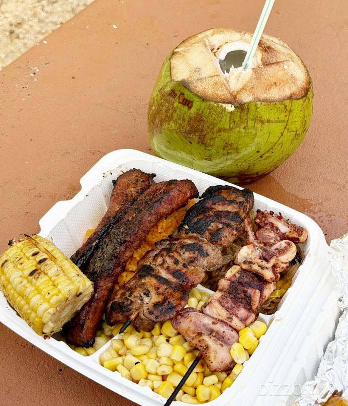 Kris BBQ에서 주문한 차모로식 바베큐와 레드라이스가 나왔다. 숯불에 구운 고기와 붉은빛 찐쌀의 조합은 낯설지만 금방 손에 익는 맛이다.
