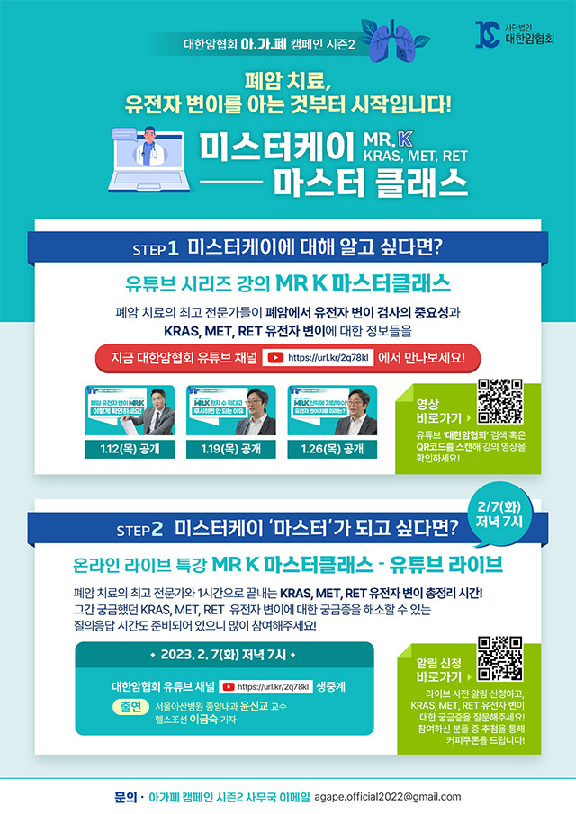 대한암협회가 2월 4일 ‘세계 암의 날(World Cancer Day)’을 맞아 희귀 유전자 변이 폐암 환자를 위한 실시간 온라인 특강을 진행한다고 2일 밝혔다.이번 특강은 처음 폐암 진단 시부터 환자가..
