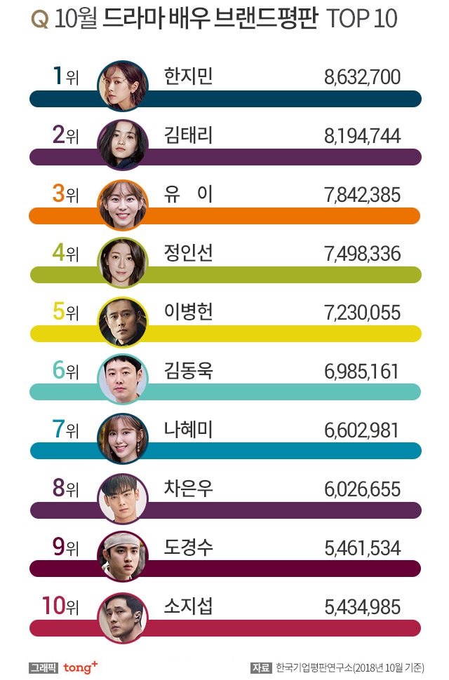 배우 한지민이 2018년 10월 빅데이터 분석결과, 드라마 배우 브랜드평판 1위를 차지했다. 한국기업평판연구소는 드라마 배우 브랜드 빅데이터를 분석하여 소비자들의 브랜드 참여지표,..